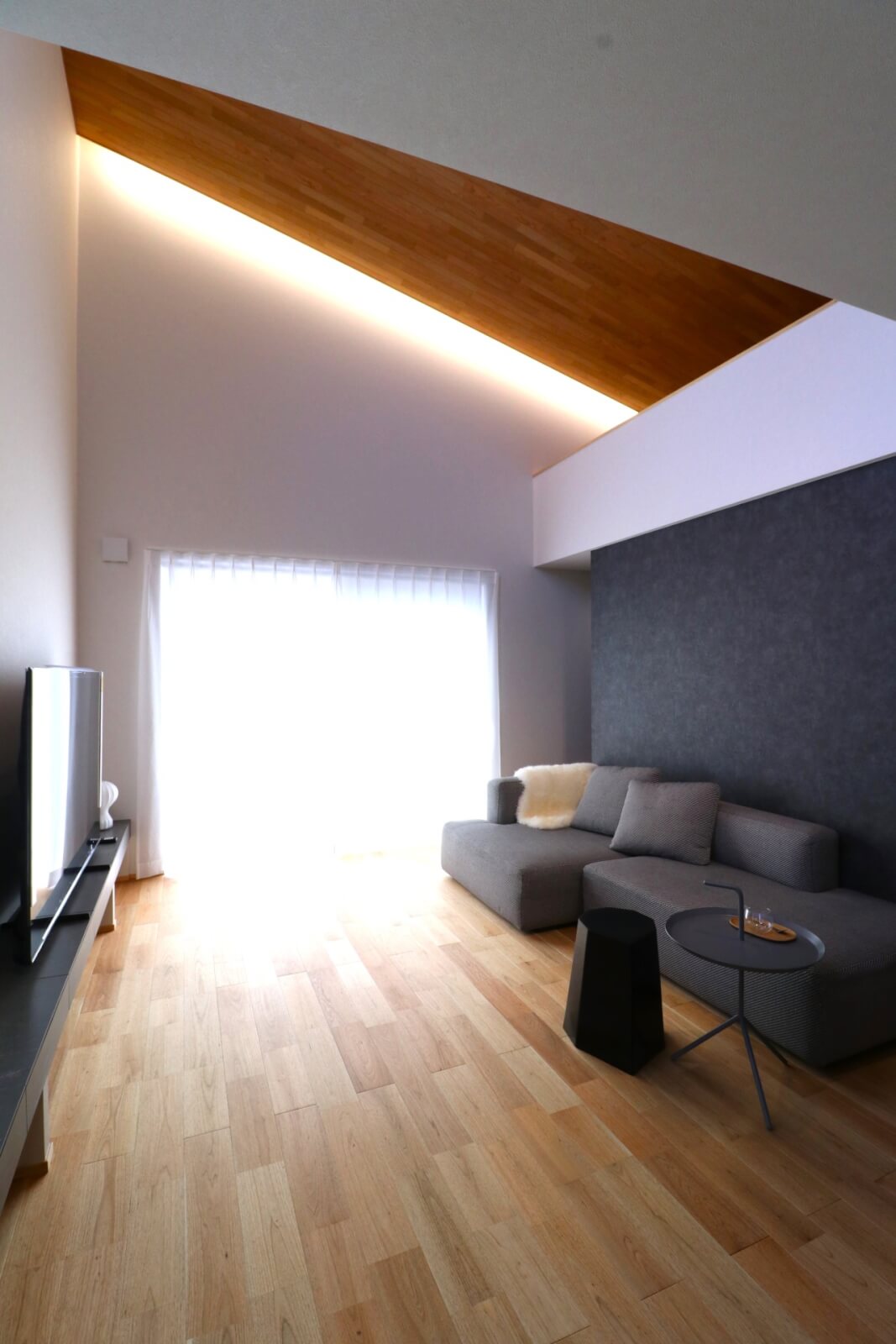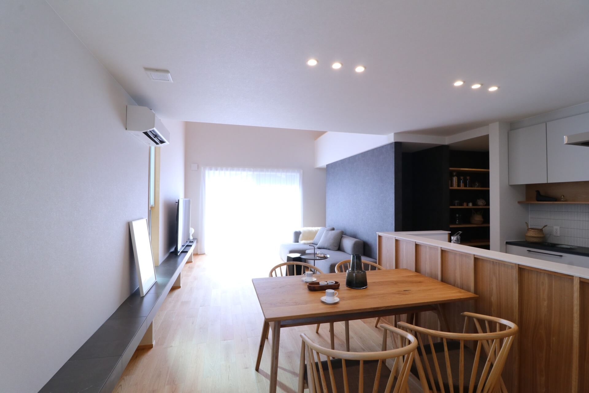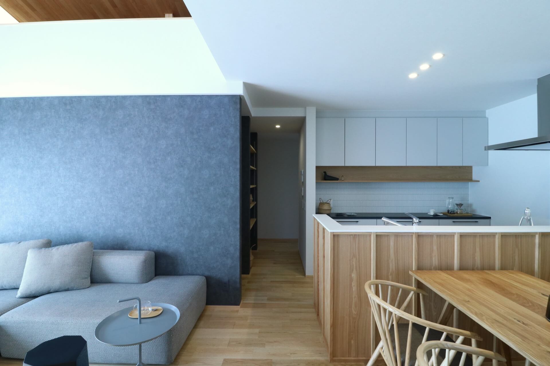 開放的な南側のリビングは、やわらかな光が差し込み家族が心地よく過ごせます。全長7メートルのカウンターは、TVボードや収納・ベンチとして使うこともできます。